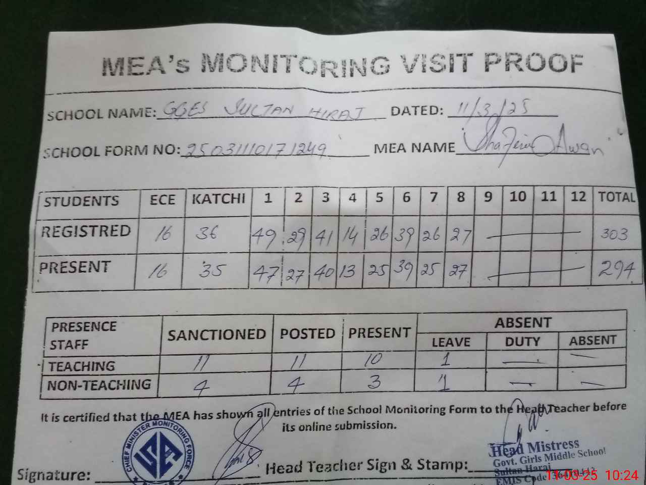| Monitoring Date: 11-03-2025 | Start Time: 11-03-2025 09:50 AM | End Time: 11-03-2025 10:29 AM | Name of MEA: SH**** AH**** | |