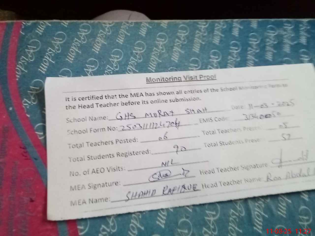 | Attendance Register | Head Teacher | MEA with School | Visit Proof |