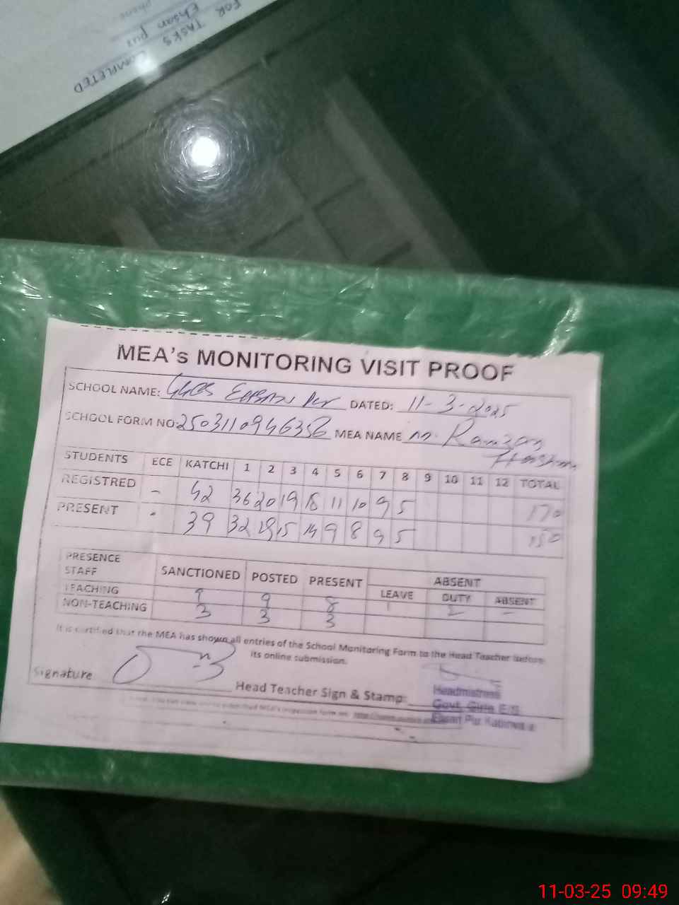 | Attendance Register | Head Teacher | MEA with School | Visit Proof |