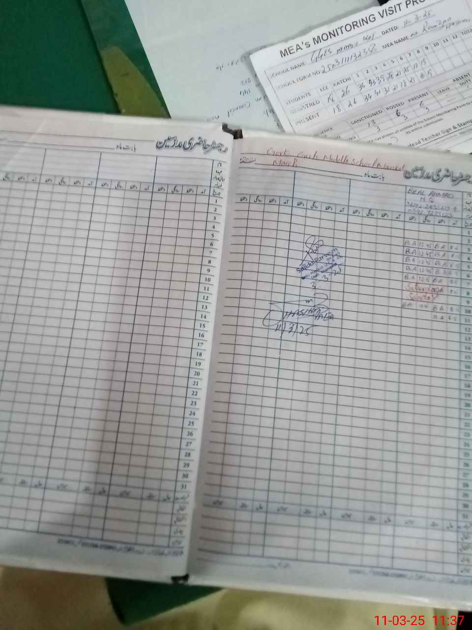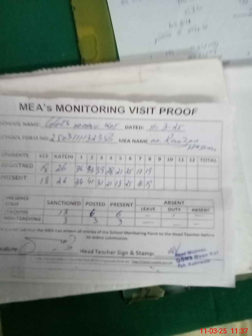 | Attendance Register | Head Teacher | MEA with School | Visit Proof |