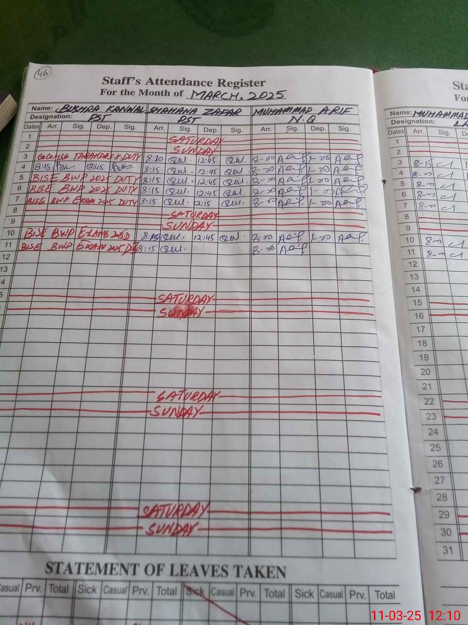 | 31**** | Bu**** Ka**** | PST | Regular | 0 | 0 | 0 | 0 | 0 | 0 | 0 | 0 | 0 | Exam Duty |