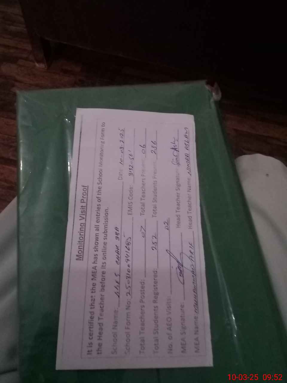 | Certified that this School was Inspected by the Undersigned MEA/DMO Today and the Information Stated Above is as Per Record. | |||||