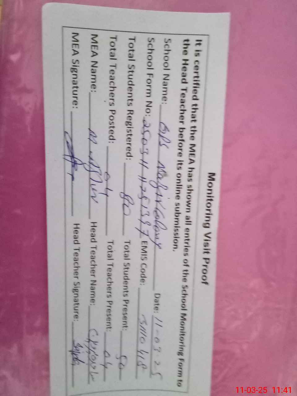 | Attendance Register | Head Teacher | MEA with School | Visit Proof |
