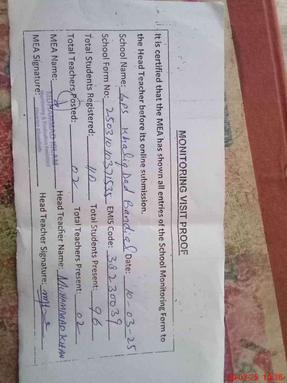 | EMIS Code: 38230039 | Name of School: GPS KHALIQ DAD BANDIAL | |||