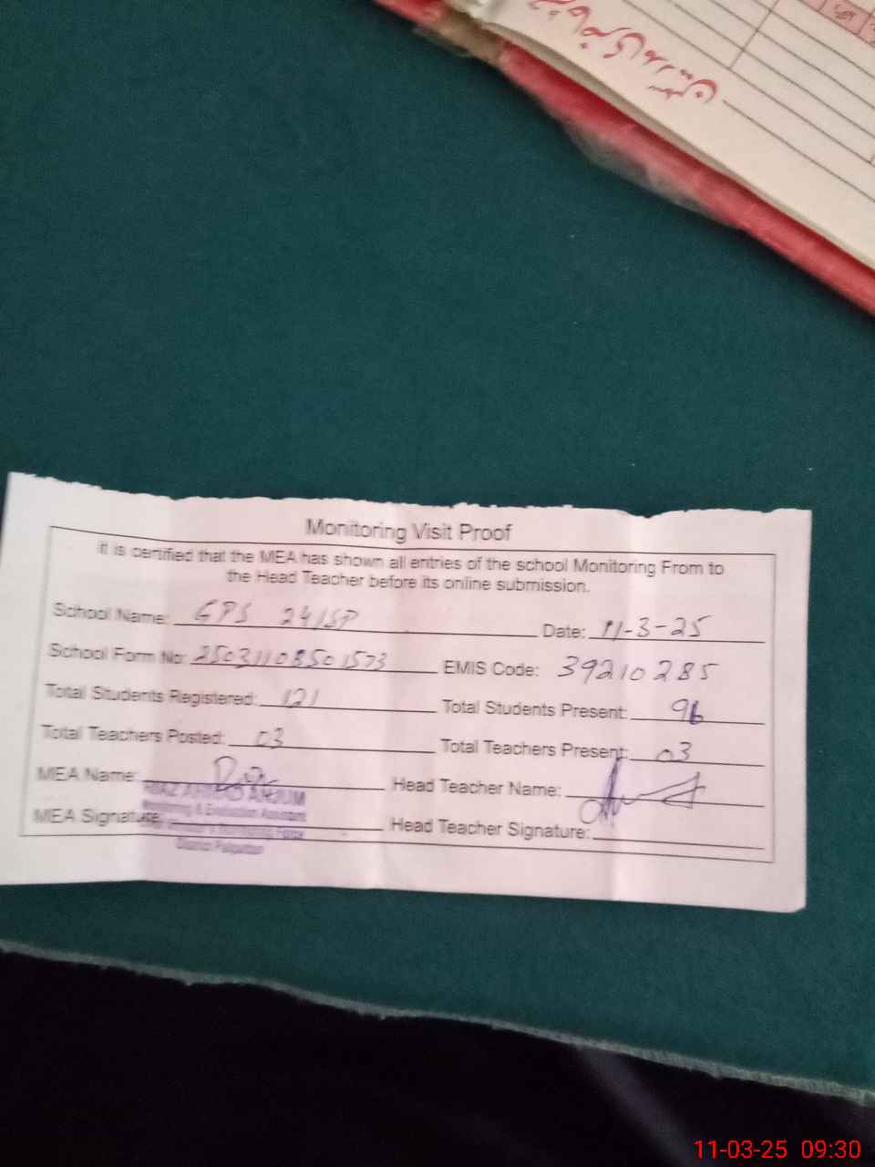 | Attendance Register | Head Teacher | MEA with School | Visit Proof |