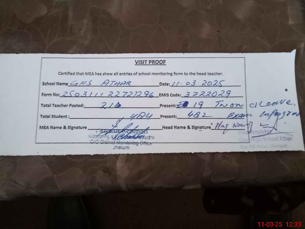 | Attendance Register | Head Teacher | MEA with School | Visit Proof |