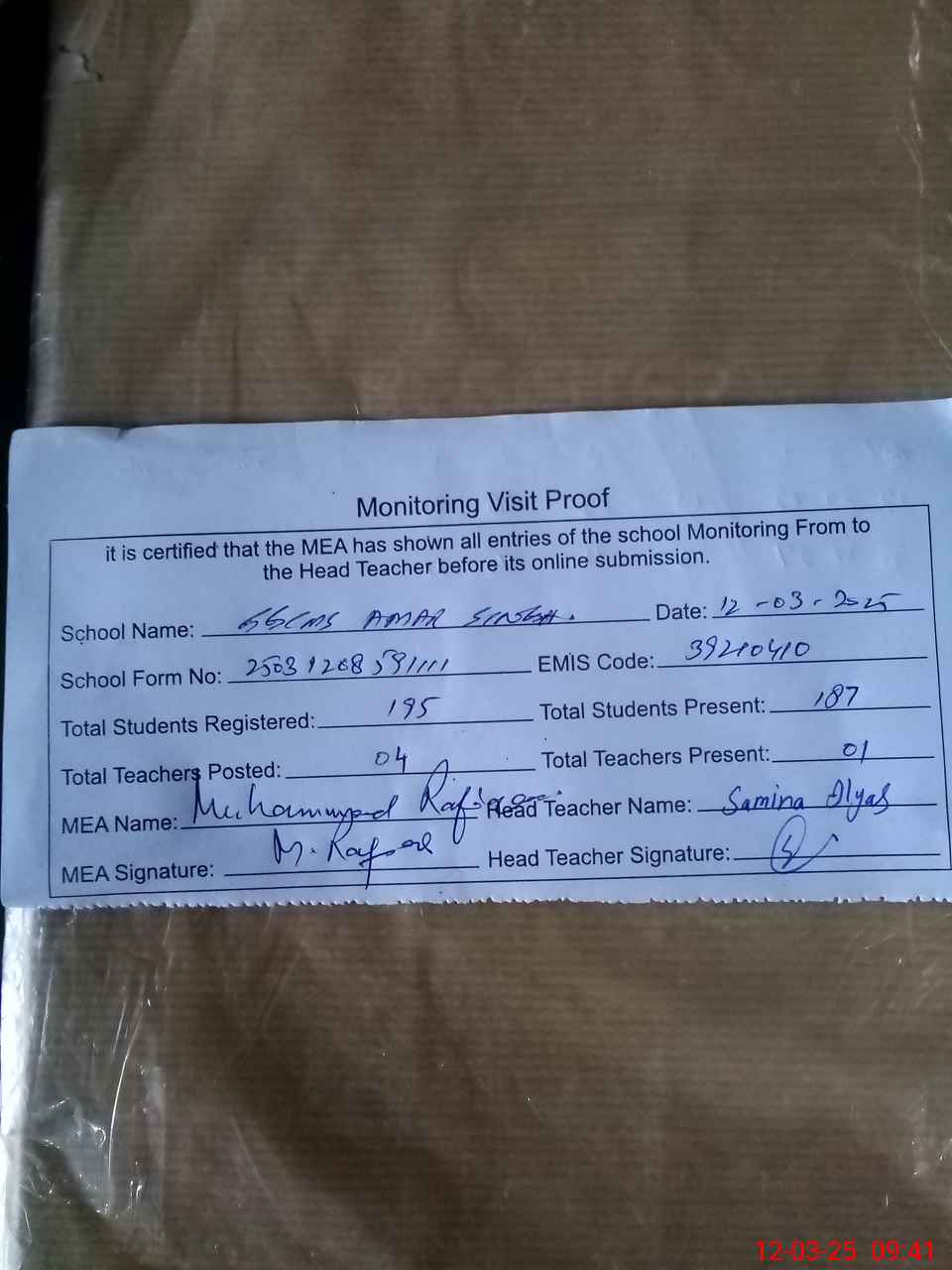 | Attendance Register | Head Teacher | MEA with School | Visit Proof |