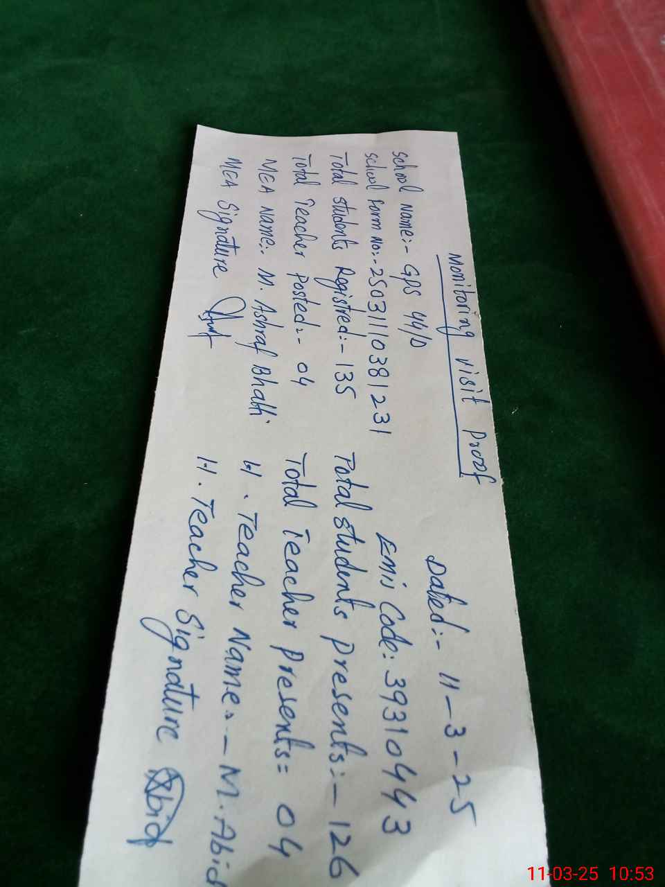 | Attendance Register | Head Teacher | MEA with School | Visit Proof |