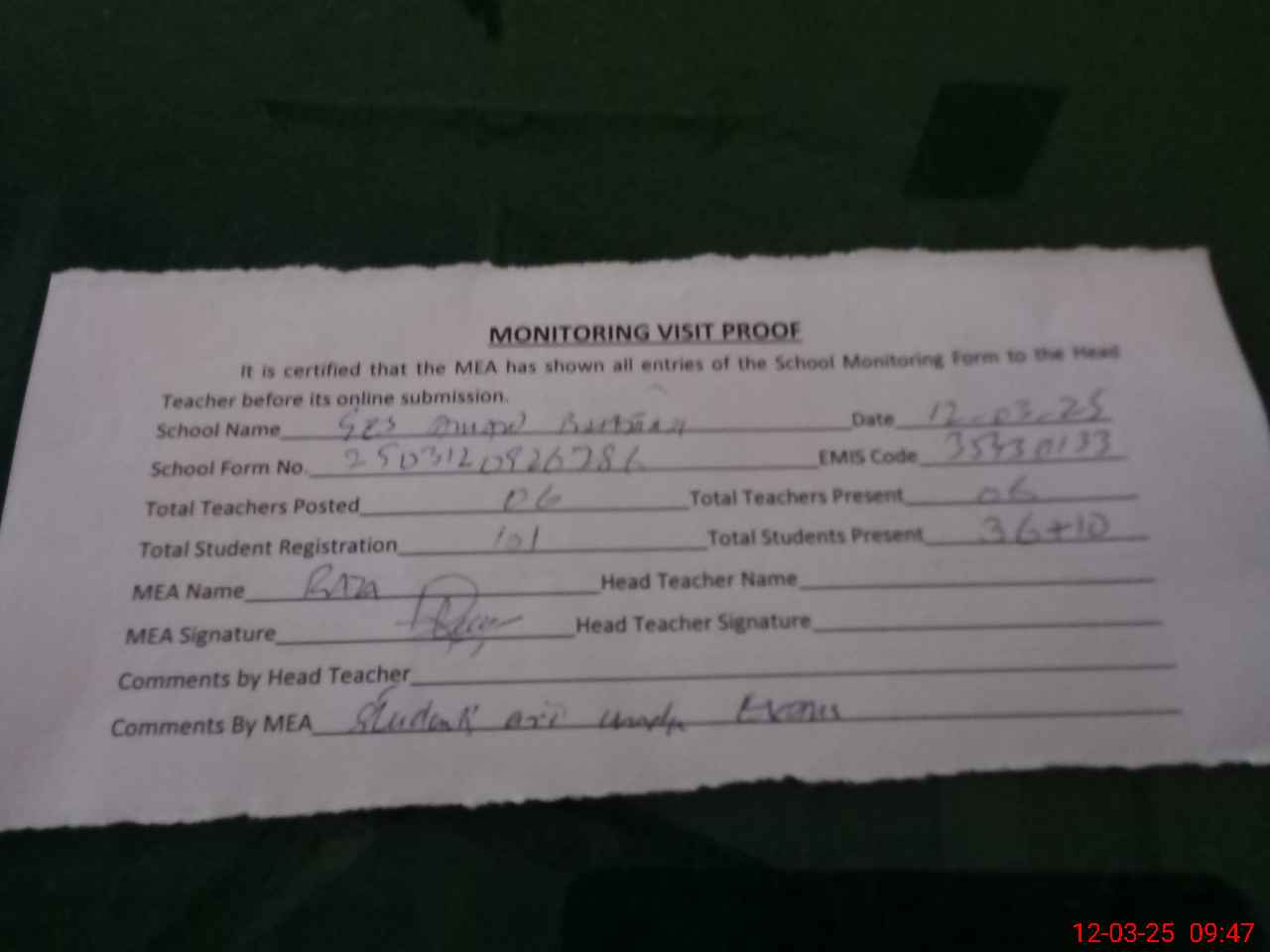 | Attendance Register | Head Teacher | MEA with School | Visit Proof |