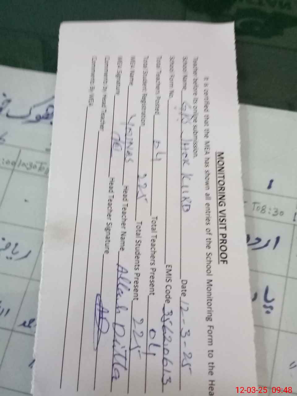 | EMIS Code: 35620613 | Name of School: GPS JHOK KHURD CHAK NO. 14/RB | |||