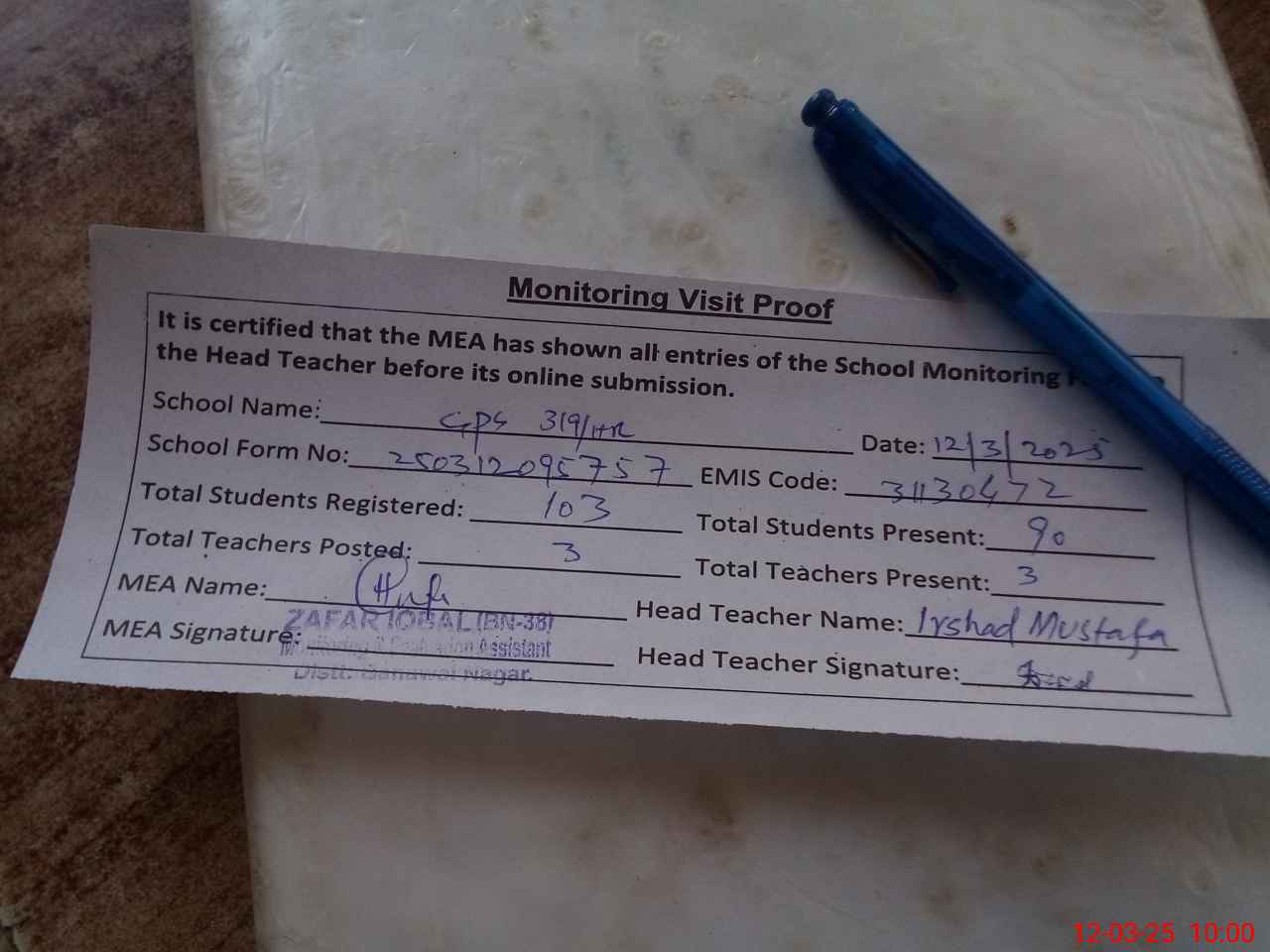| EMIS Code: 31130472 | Name of School: GPS CHAK NO 319/HR | |||