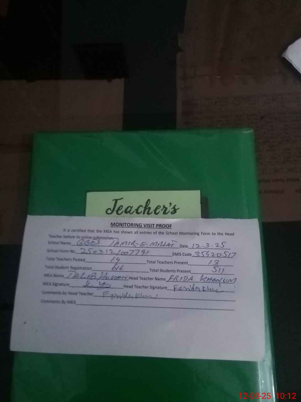 | Attendance Register | Head Teacher | MEA with School | Visit Proof |