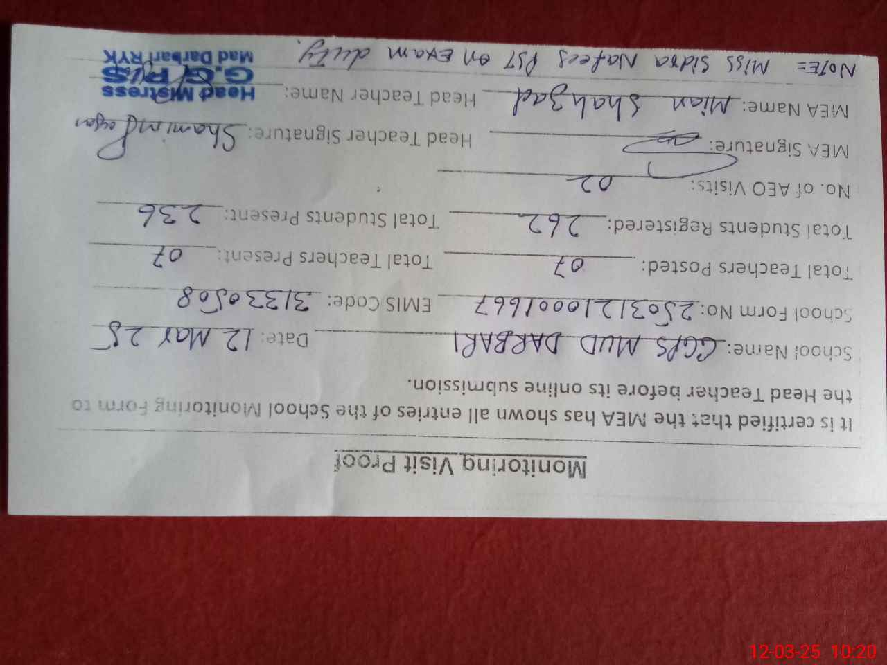 | Attendance Register | Head Teacher | MEA with School | Visit Proof |