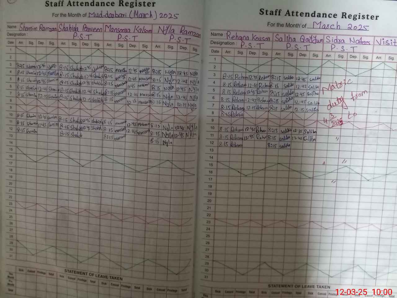 | Remarks (Use Separate Page if Required): Miss Sidra Nafees PST teacher on Exam duty | |||||