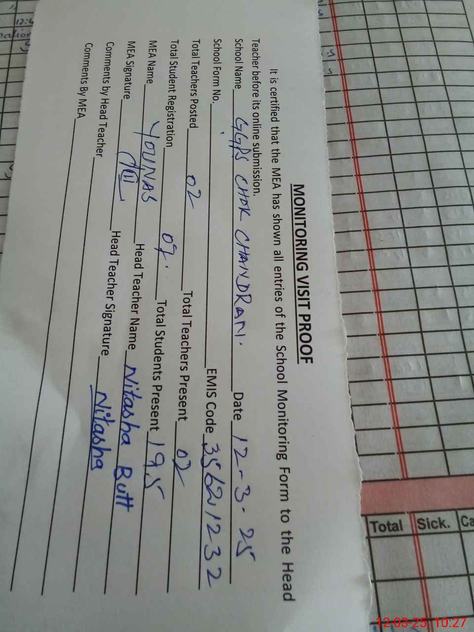 | Attendance Register | Head Teacher | MEA with School | Visit Proof |