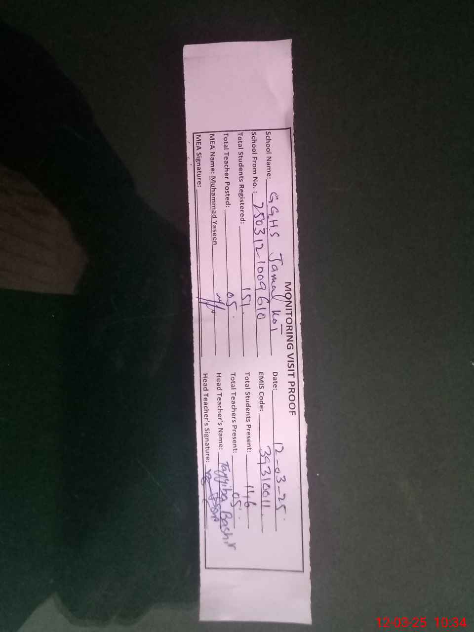 | Attendance Register | Head Teacher | MEA with School | Visit Proof |