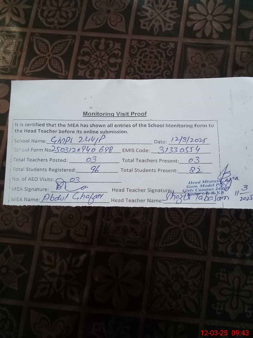 | Monitoring Date: 12-03-2025 | Start Time: 12-03-2025 08:49 AM | End Time: 12-03-2025 09:48 AM | Name of MEA: Ab**** Gh**** | |