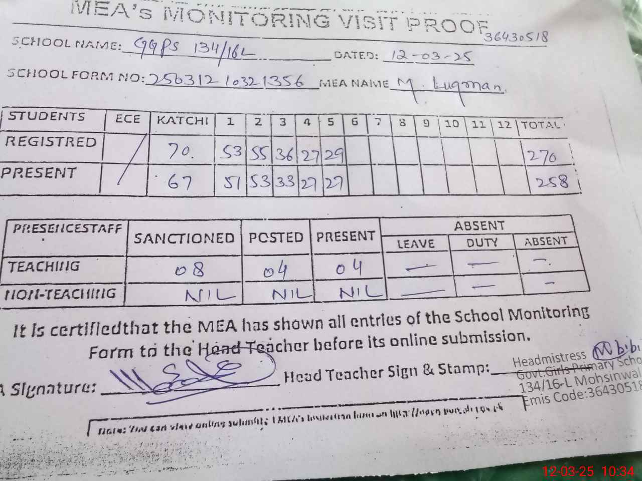 | Attendance Register | Head Teacher | MEA with School | Visit Proof |