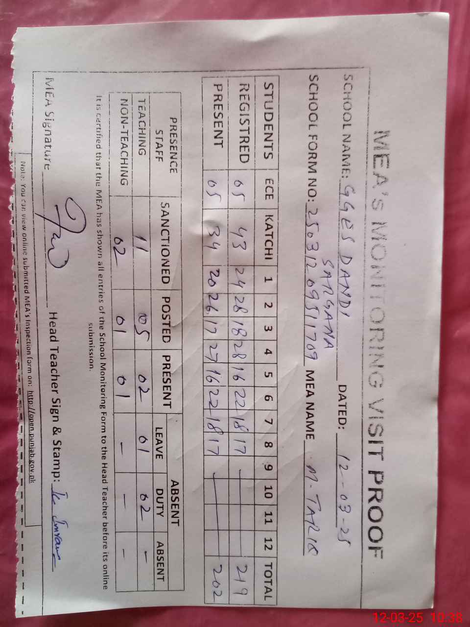 | EMIS Code: 36410119 | Name of School: GGES DANDI SARGANA, P/O SARDAR PUR, SARAI SIDHU | |||