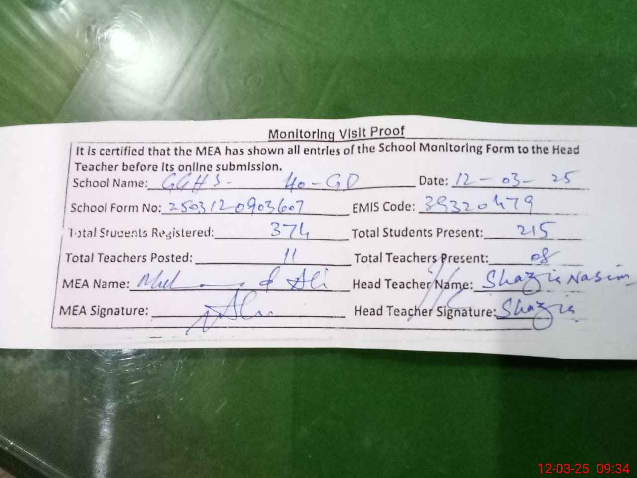 | Attendance Register | Head Teacher | MEA with School | Visit Proof |