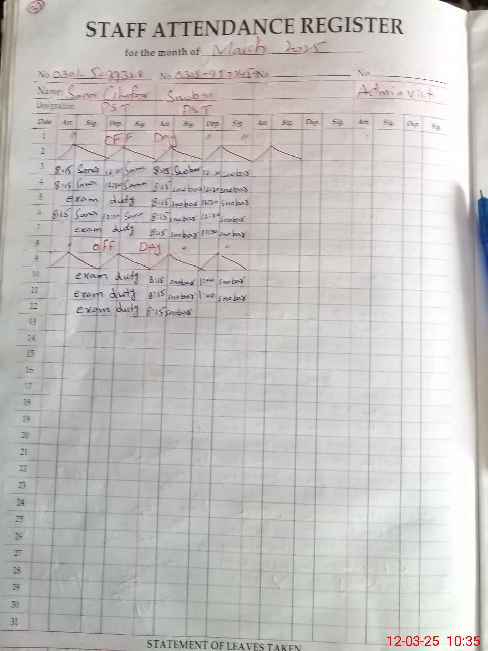 | 35**** | Sa**** Gh**** | PST | Regular | 0 | 0 | 0 | 0 | 0 | 0 | 0 | 0 | 0 | Exam Duty |