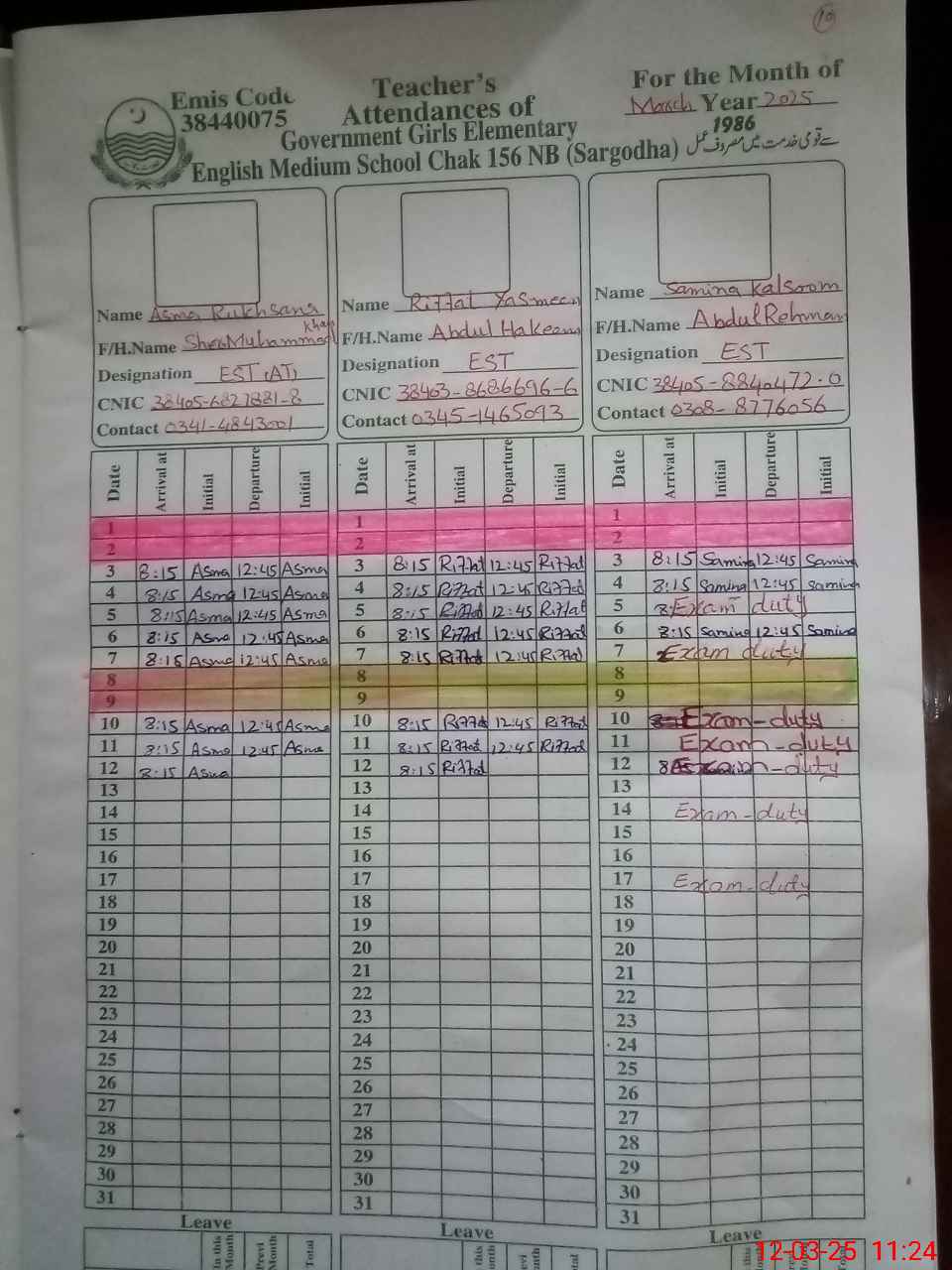 | 38**** | Sa**** Ka**** | EST | Regular | 0 | 0 | 0 | 0 | 0 | 0 | 0 | 0 | 0 | Exam Duty |
