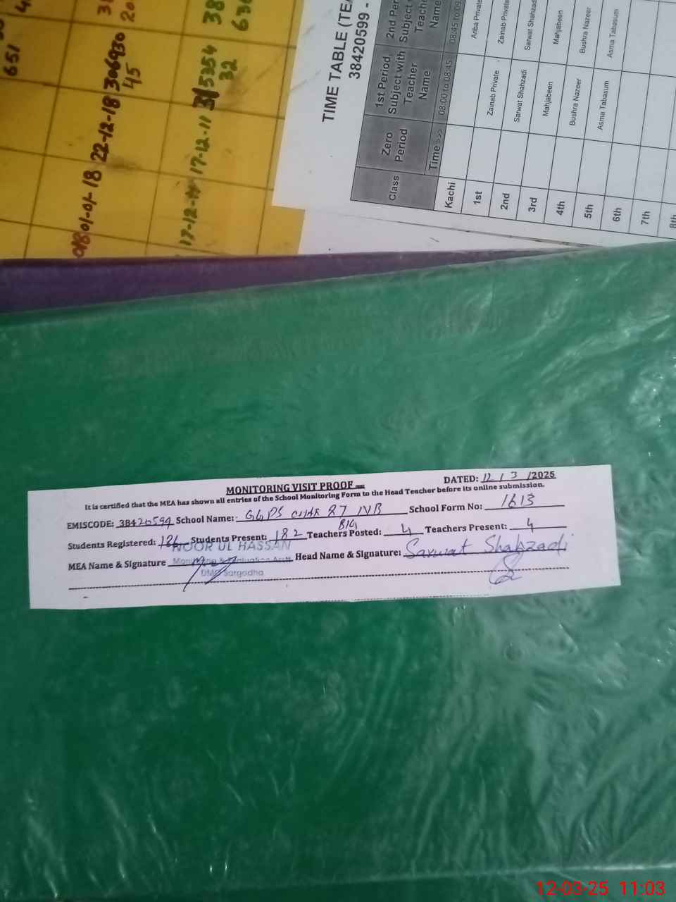 | Attendance Register | Head Teacher | MEA with School | Visit Proof |
