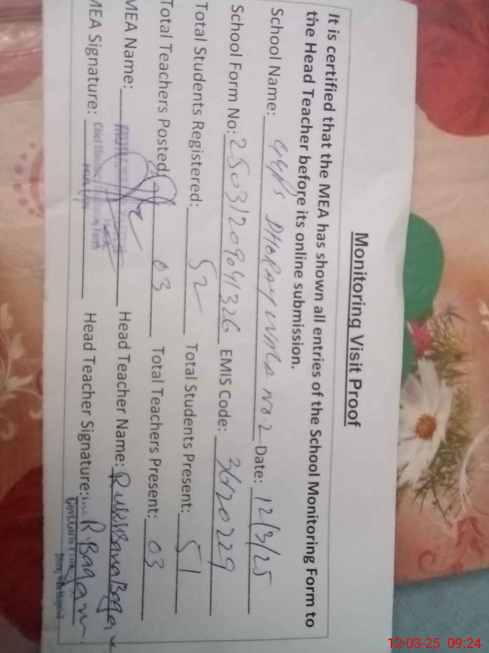 | Attendance Register | Head Teacher | MEA with School | Visit Proof |