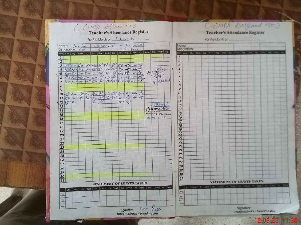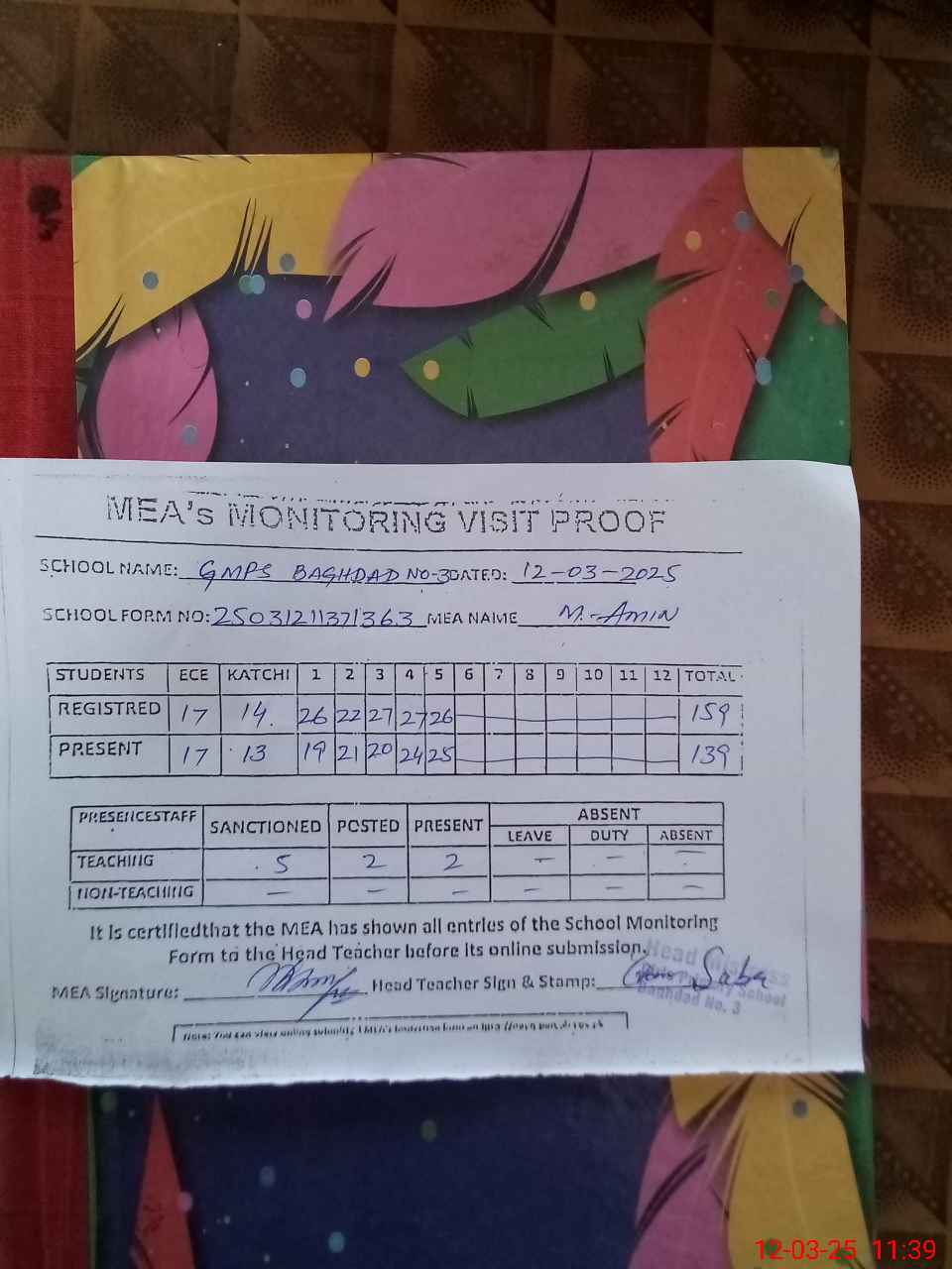| Attendance Register | Head Teacher | MEA with School | Visit Proof |