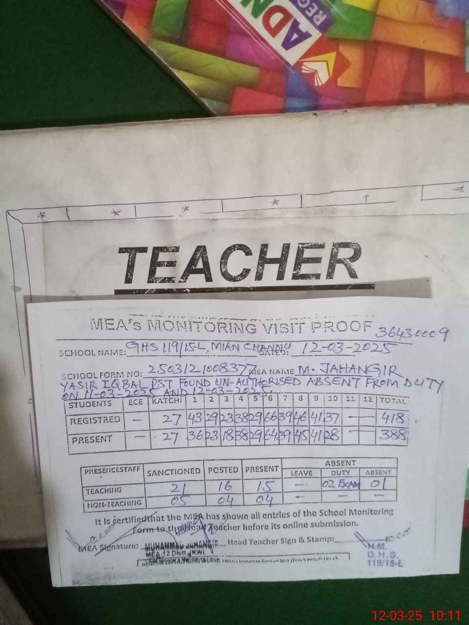 | Remarks (Use Separate Page if Required): YASIR IQBAL PST FOUND UN AUTHORISED ABSENT FROM DUTY ON 11 MARCH 2025 AND 12 MARCH 2025 SHAHID JAMIL SR HM HAS BEEN TRANSFERRED FROM THIS SCHOOL ON 22 OCTOBER 2024 BUT HIS NAME IS STILL EXIST IN SIS LIST OF PMIU MEA TAB LIST RANDOM CLASS ONE IS NOW IN CLASS FOUR | |||||