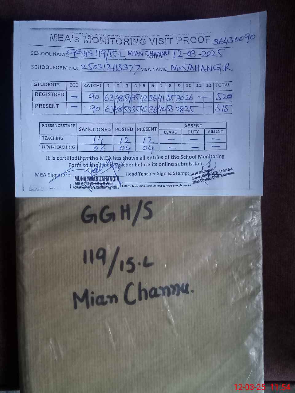 | Attendance Register | Head Teacher | MEA with School | Visit Proof |