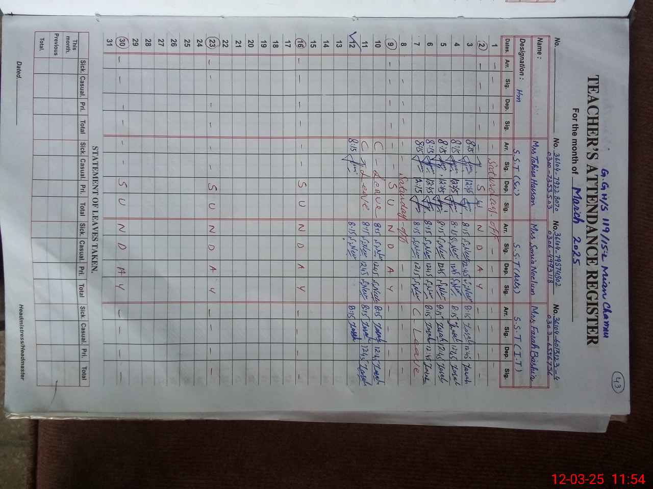 | Name: Ta**** Ha**** Designation: (School Headmaster's/Headmistress's) SST Science Phone/Cell Number: 03**** |