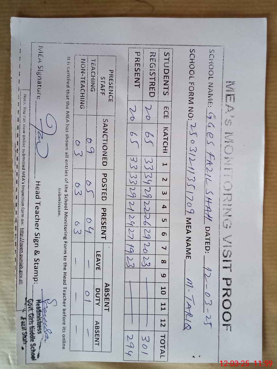 | Attendance Register | Head Teacher | MEA with School | Visit Proof |