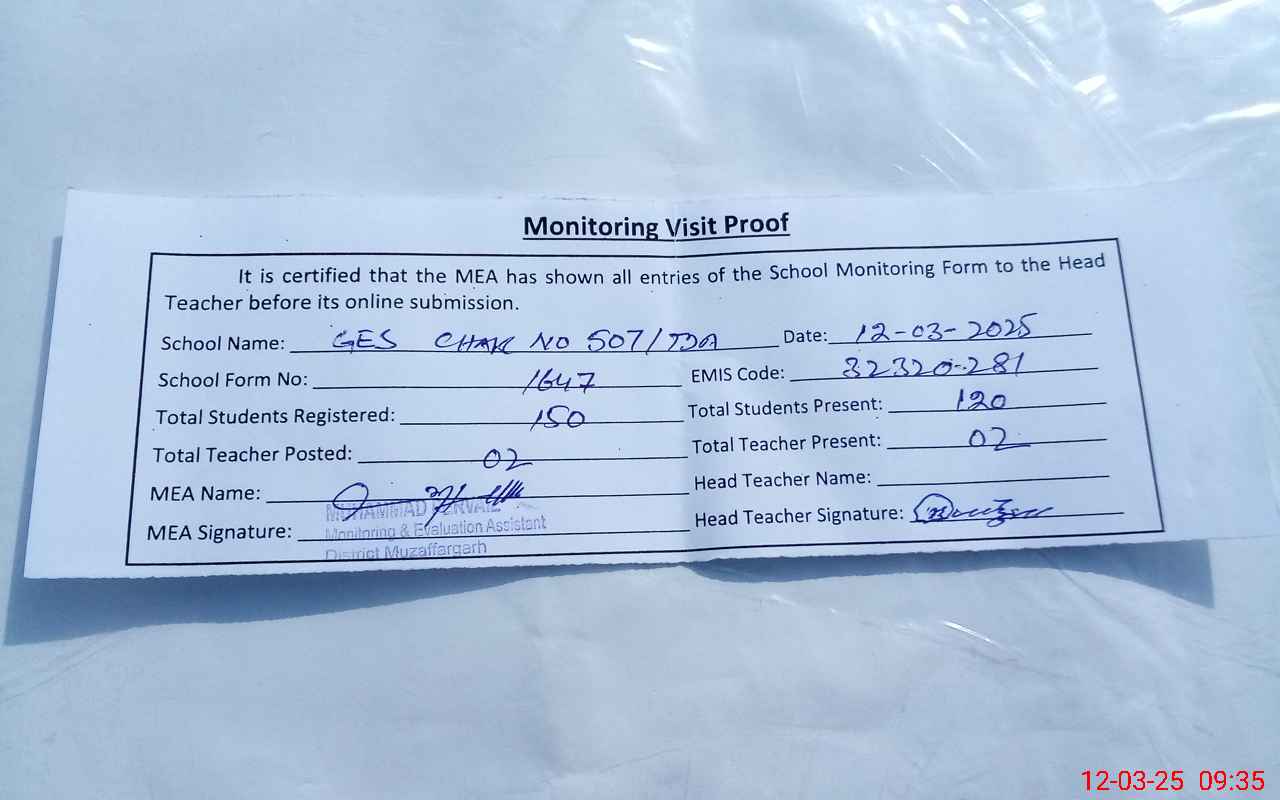 | EMIS Code: 32320281 | Name of School: GES CHAK NO.507 TDA | |||