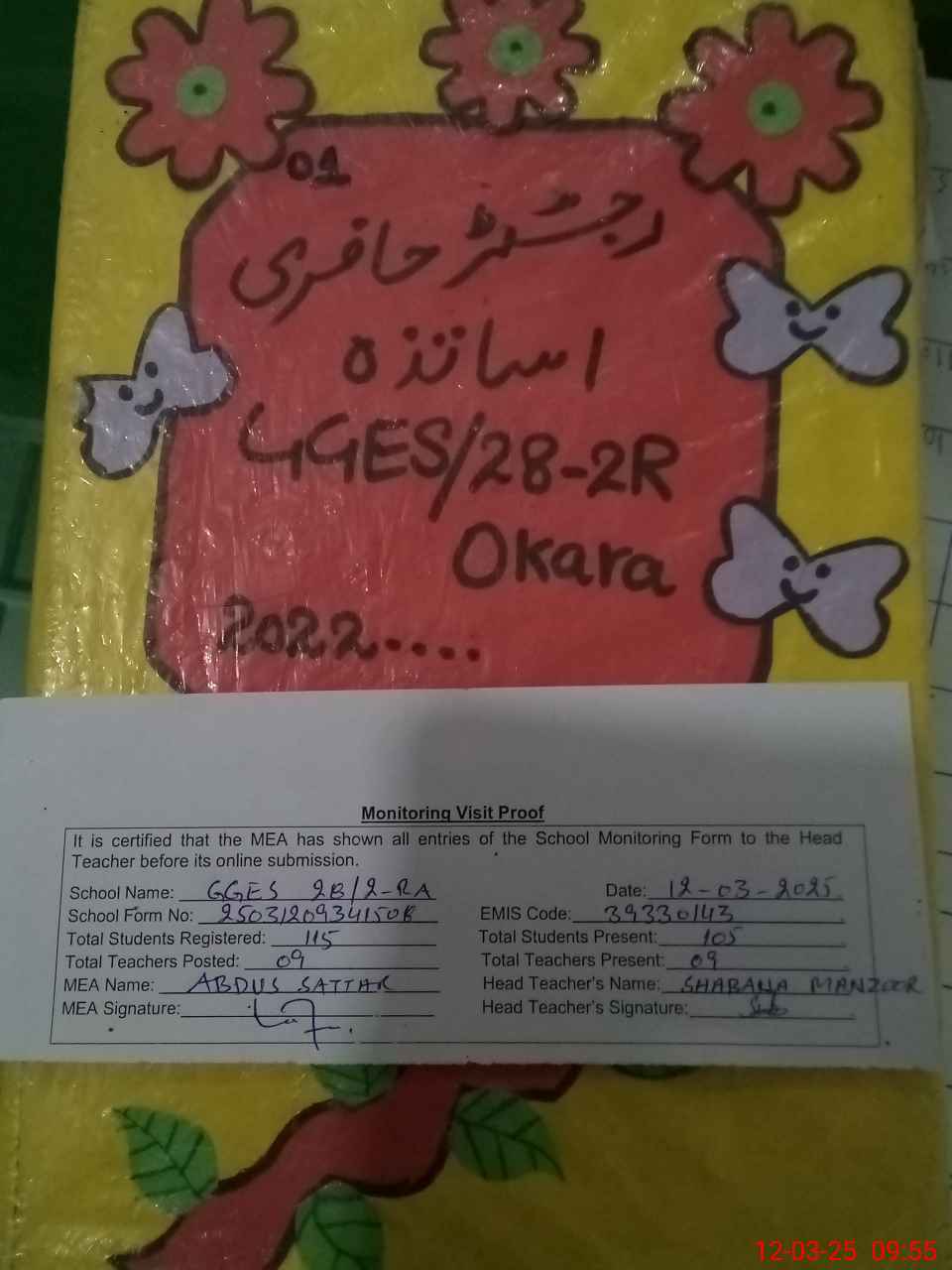 | District: OKARA | Tehsil: OKARA | Markaz: 33/2R - FEMALE | Level: Middle | |