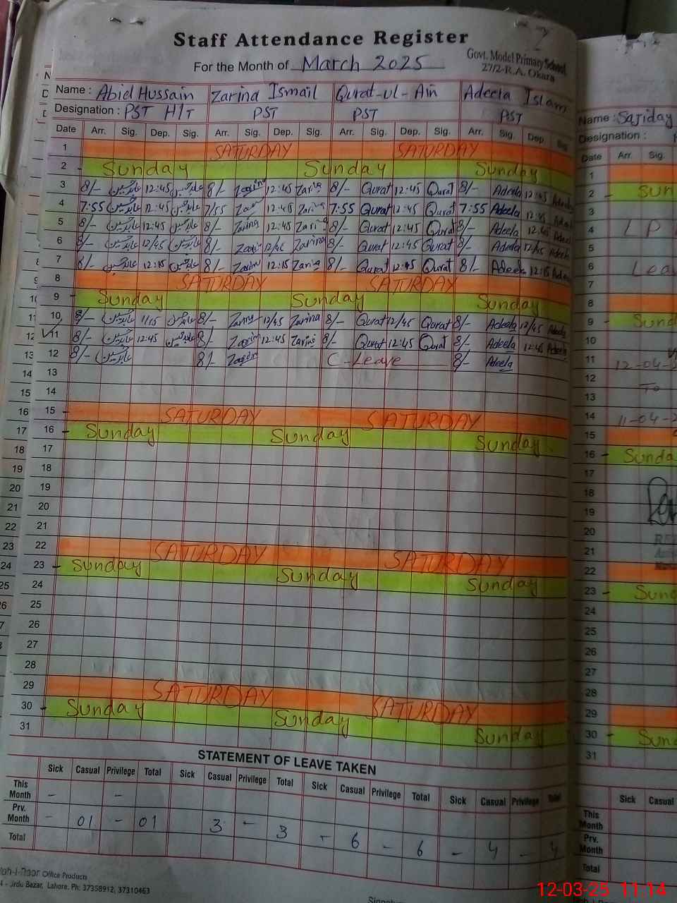 | CNIC | Full Name | Designation | R/C | Absence During Last Calender Month |