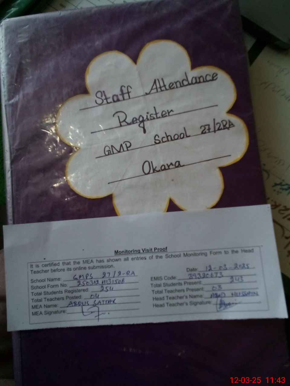 | Attendance Register | Head Teacher | MEA with School | Visit Proof |