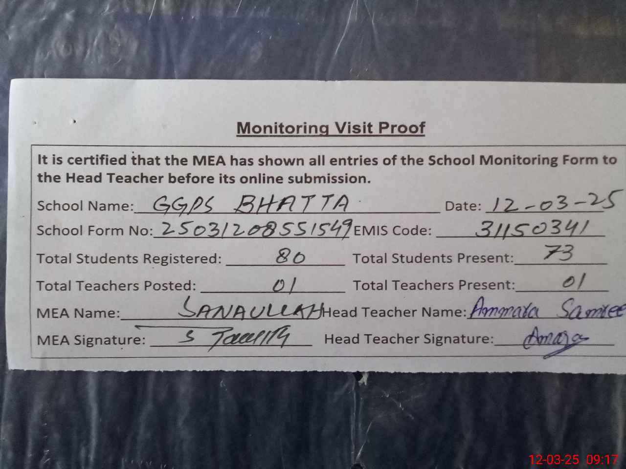 | EMIS Code: 31150341 | Name of School: GGPS BHUTTA | |||