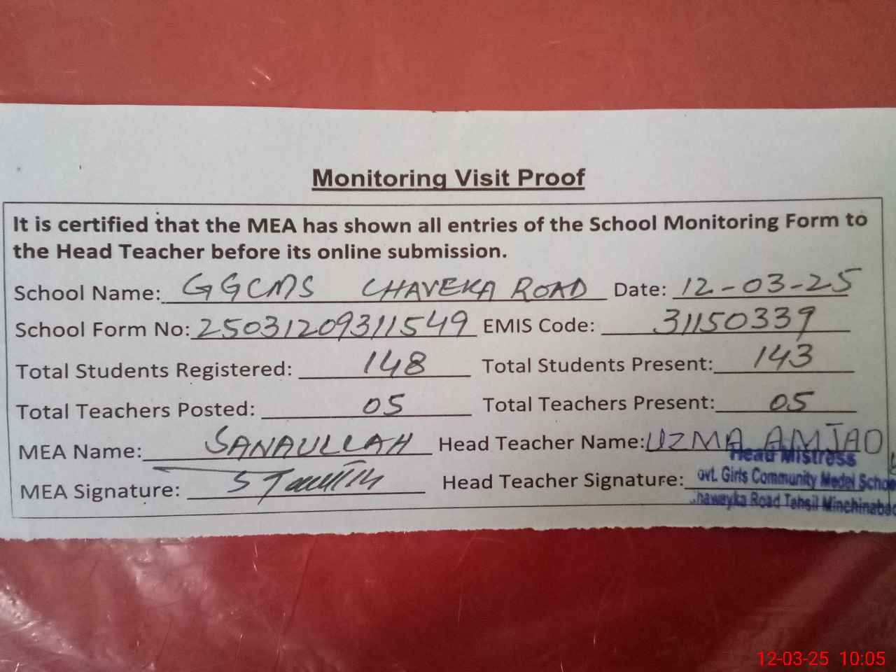 | Attendance Register | Head Teacher | MEA with School | Visit Proof |
