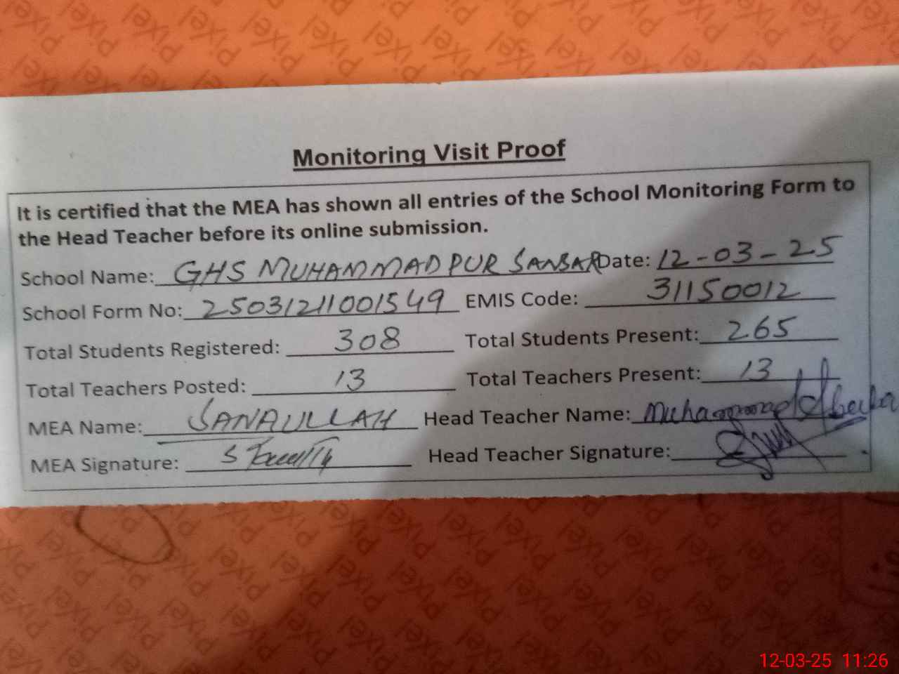 | EMIS Code: 31150012 | Name of School: GHS MUHAMMAD PUR SANSARAN | |||