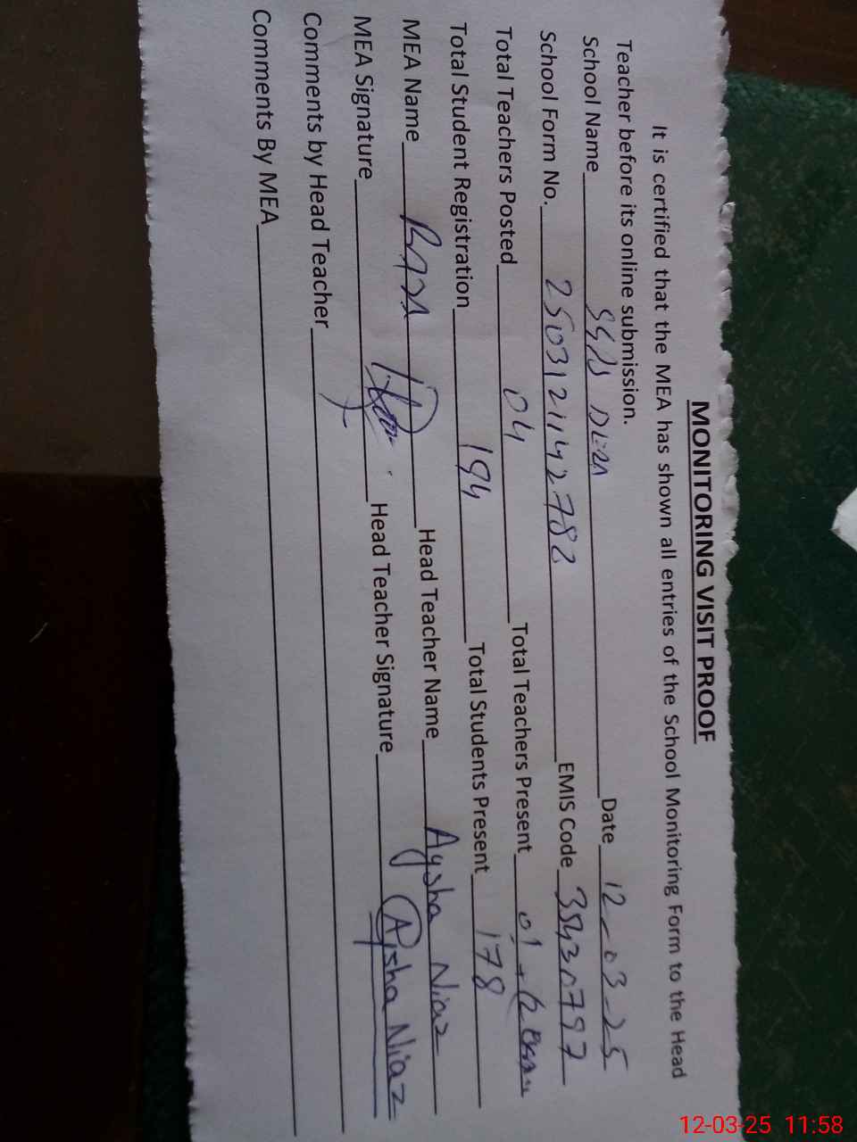| Attendance Register | Head Teacher | MEA with School | Visit Proof |