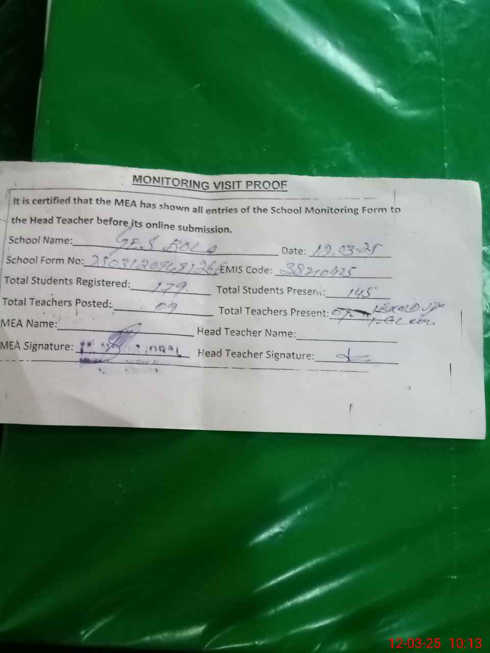 | Attendance Register | Head Teacher | MEA with School | Visit Proof |
