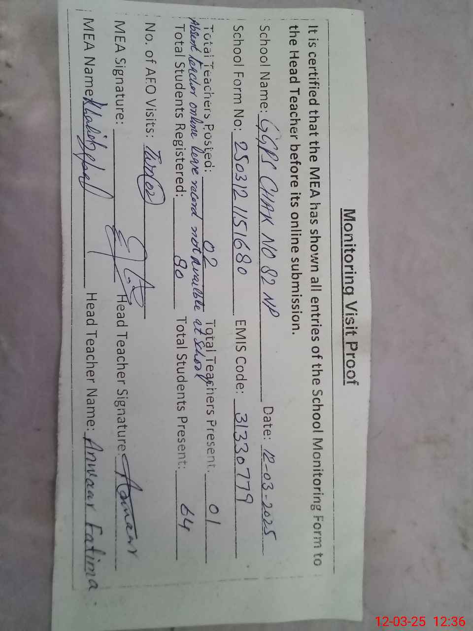 | EMIS Code: 31330779 | Name of School: GGPS CHAK NO. 82/NP | |||
