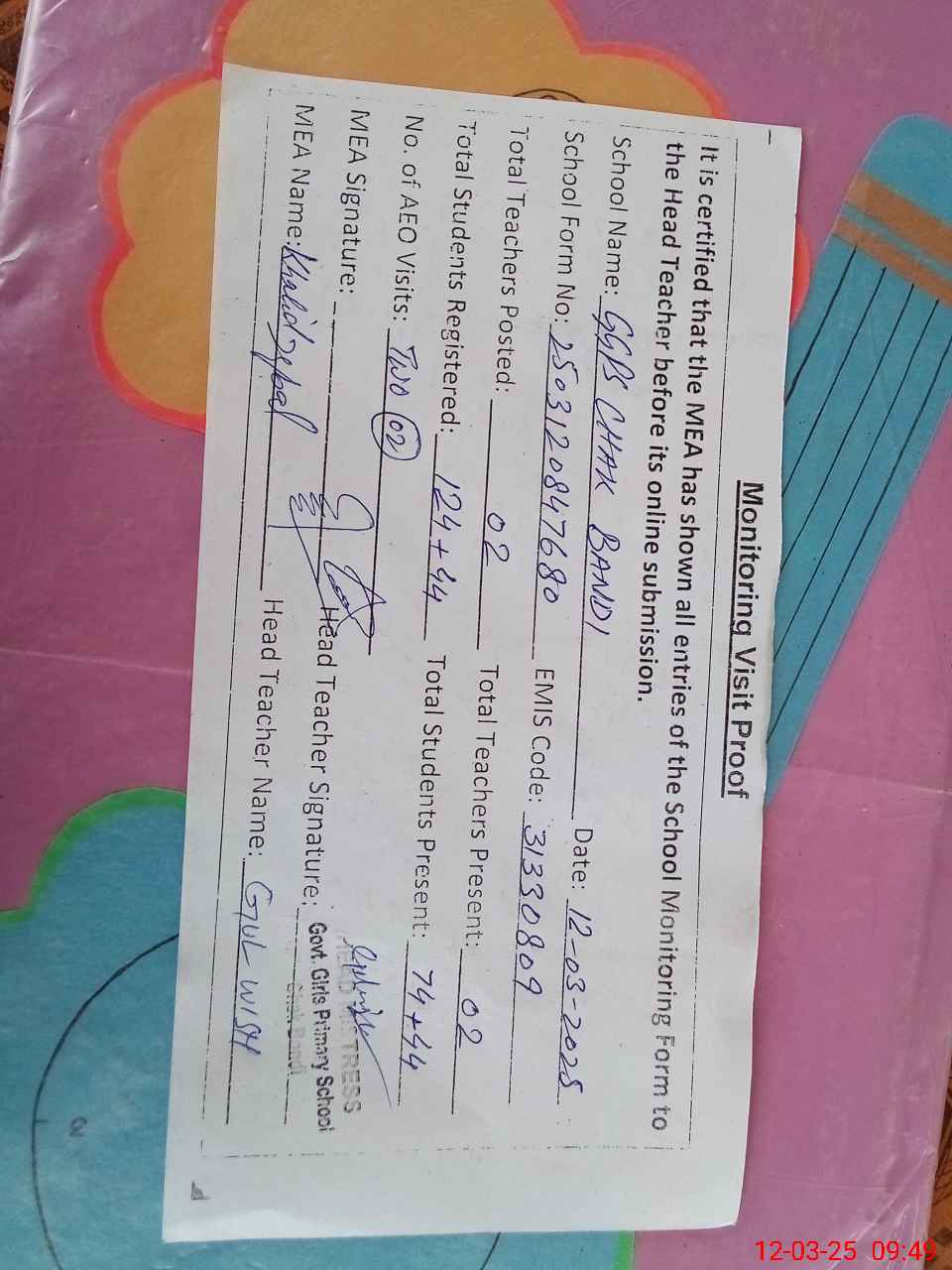 | Attendance Register | Head Teacher | MEA with School | Visit Proof |