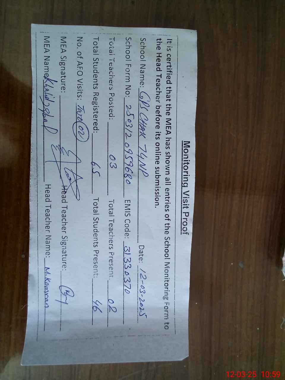 | Attendance Register | Head Teacher | MEA with School | Visit Proof |