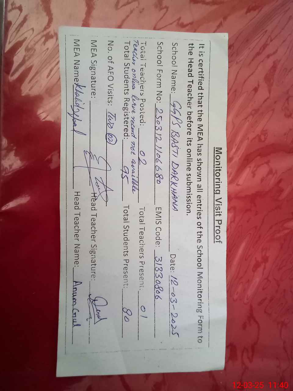 | Attendance Register | Head Teacher | MEA with School | Visit Proof |