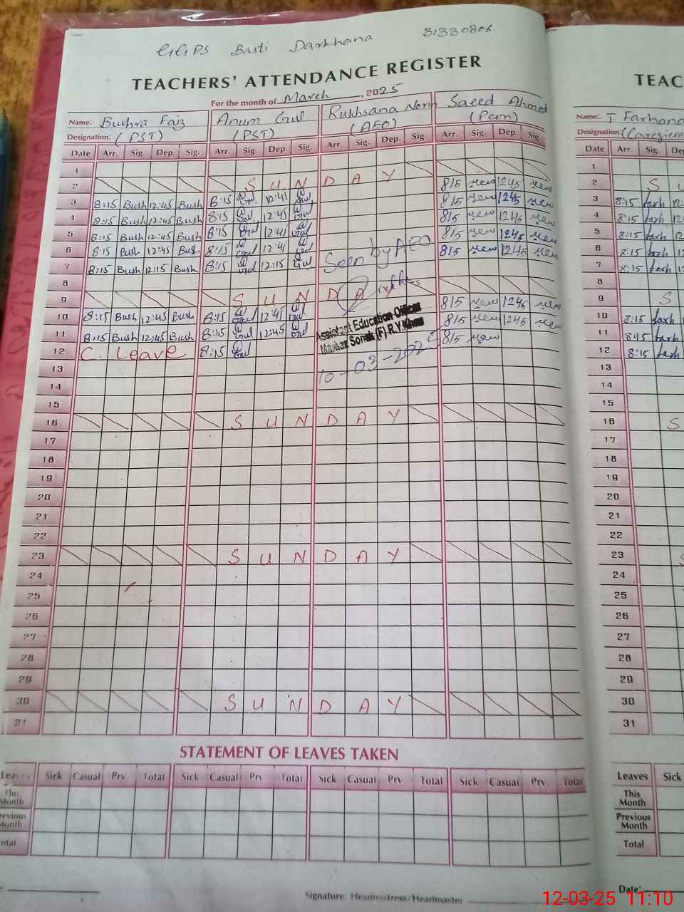 | Name: BU**** FA**** Designation: (School Headmaster's/Headmistress's) ESE (SCI-MATH) Phone/Cell Number: 03**** |