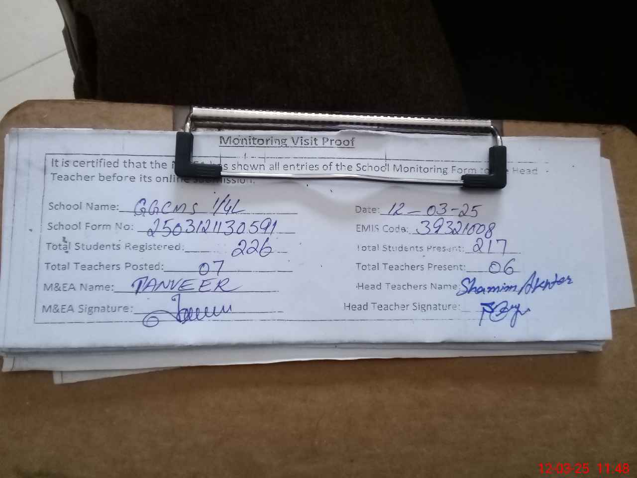| Attendance Register | Head Teacher | MEA with School | Visit Proof |