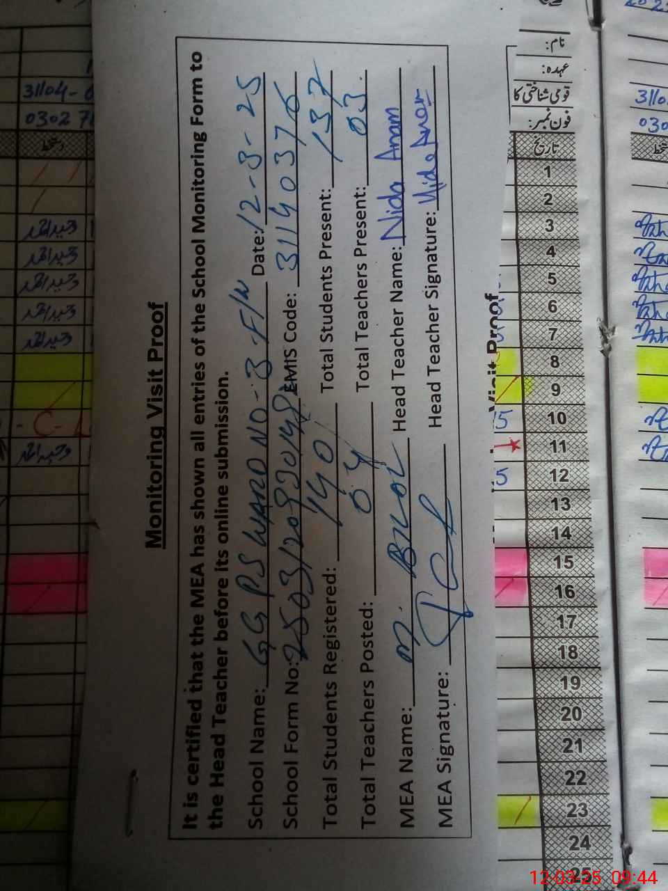 | Attendance Register | Head Teacher | MEA with School | Visit Proof |