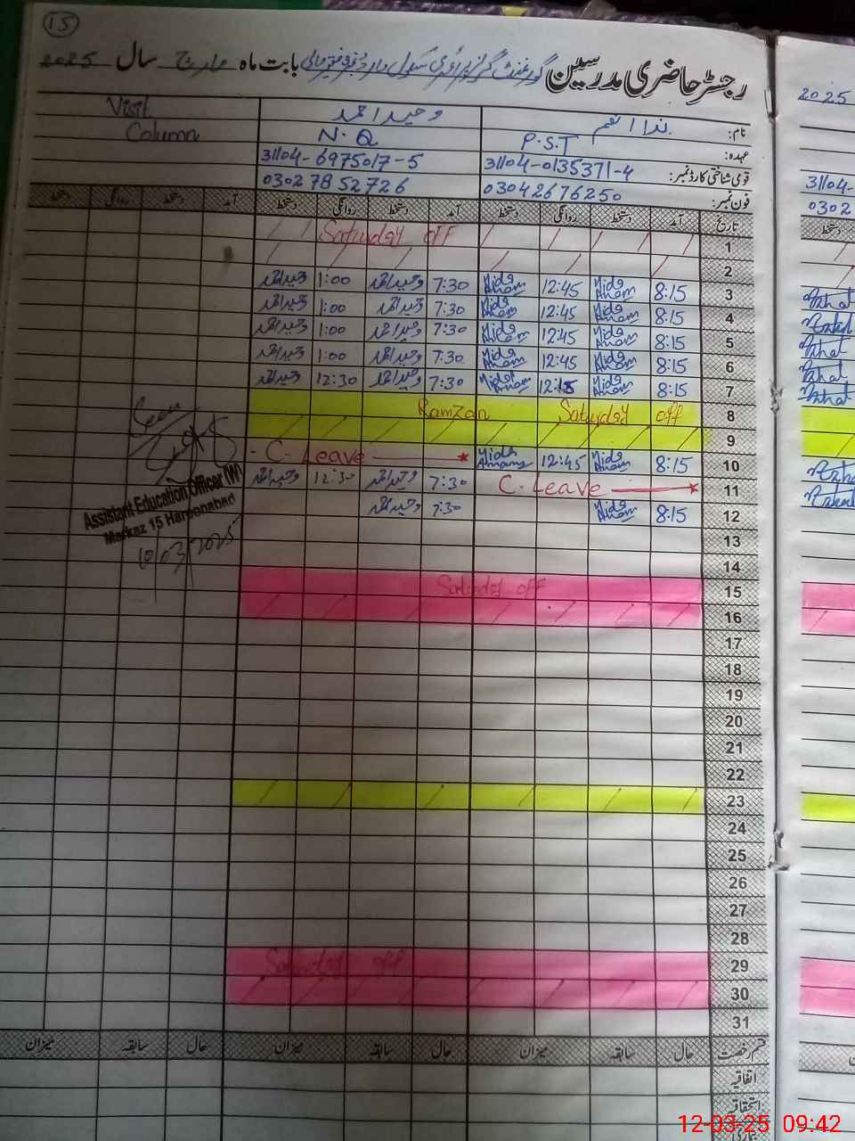 | CNIC | Full Name | Designation | R/C | Absence During Last Calender Month |